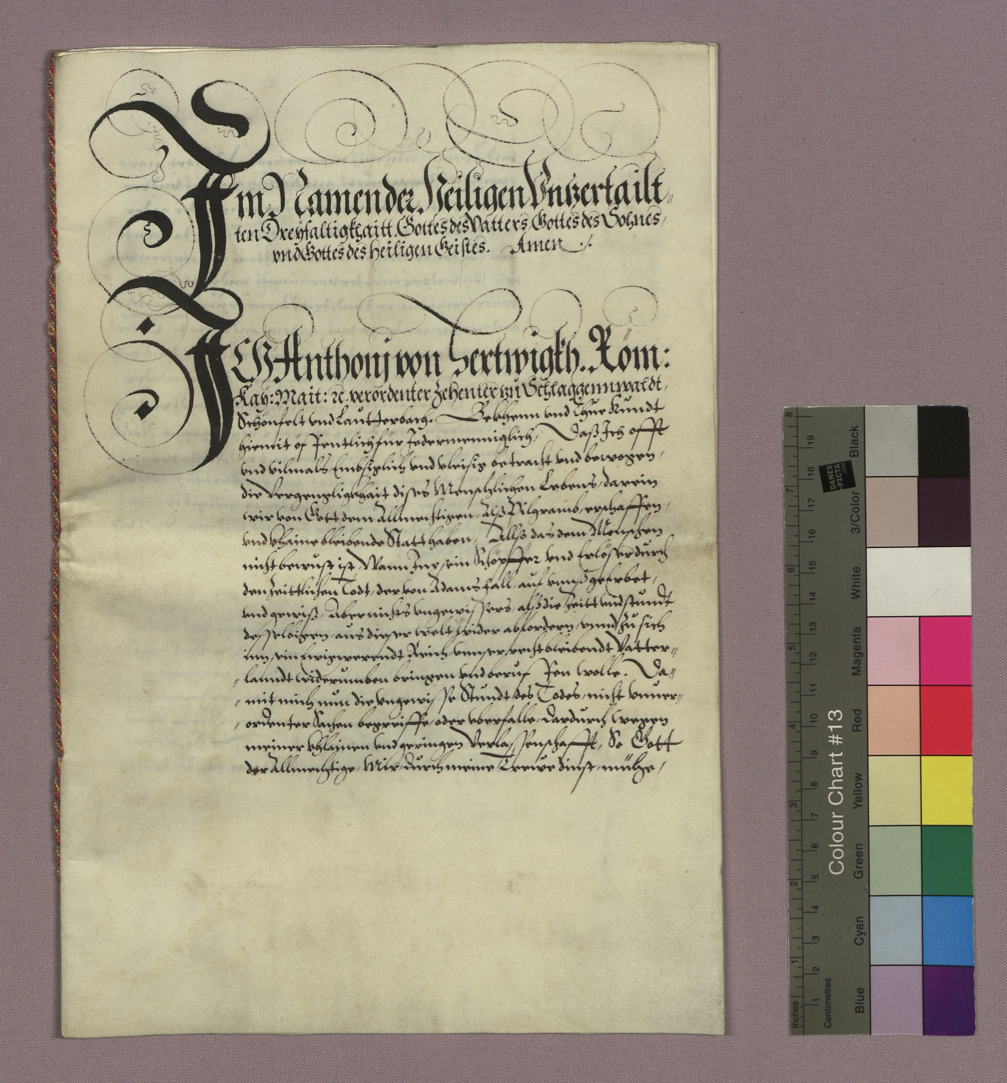 IdentifikátoryÚložištěArchiv: Sokolov (státní archiv) FondNázev fondu: Archiv města Horní SlavkovČíslo fondu: 00100Značka fondu: AM Horní Slavkov DokumentInv. číslo: 645 DataceDatace: 30.04.1594 Vertical Tabs Materiál / formaFormální popis: pergamen, sešitRozměry: 21 × 32 cmJazyk: němčinaPočet listů: 4Typ: listina PečeťPečeť: pečeti vydavatele a svědků jsou přitištěny pod krytem papíru ObsahRegest: Antonín z Hertwigu, výběrčí královského horního desátku v Horním Slavkově, činí za přítomnosti Eliáše Schmidtgrabnera z Lustenecku, rentmistra Království českého, Adama Trötschera a Jana Hackenschmidta z Horního Slavkova poslední vůli. Místo: Horní Slavkov (Schlaggenwald) Poloha f: POINT (0 0)