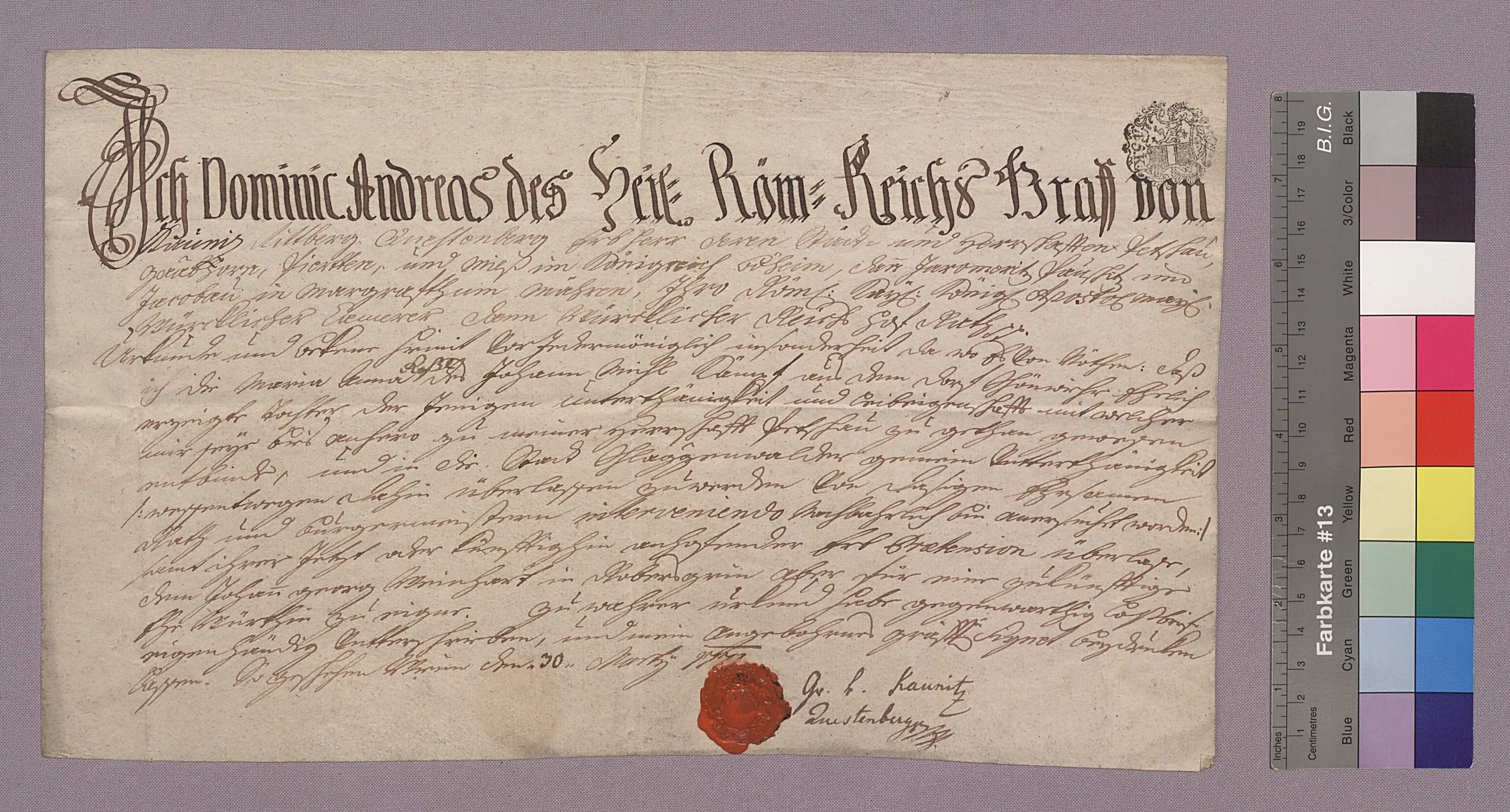 IdentifikátoryÚložištěArchiv: Sokolov (státní archiv) FondNázev fondu: Archiv města Horní SlavkovČíslo fondu: 00100Značka fondu: AM Horní Slavkov DokumentInv. číslo: 2303 DataceDatace: 30.03.1771 Vertical Tabs Materiál / formaFormální popis: papír, dvojlistRozměry: 35 × 21 cmJazyk: němčinaTyp: listina PečeťPečeť: pečeť vydavatele je přitištěna ObsahRegest: Dominik Ondřej z Kaunitz, Rittbergu a Questenbergu uděluje Marii Anně Rozině Kempfové z Krásného Jezu výhost do Hájů na panství města Horního Slavkova. Místo: Wien (Vídeň) [Rakousko] Poloha f: POINT (0 0)